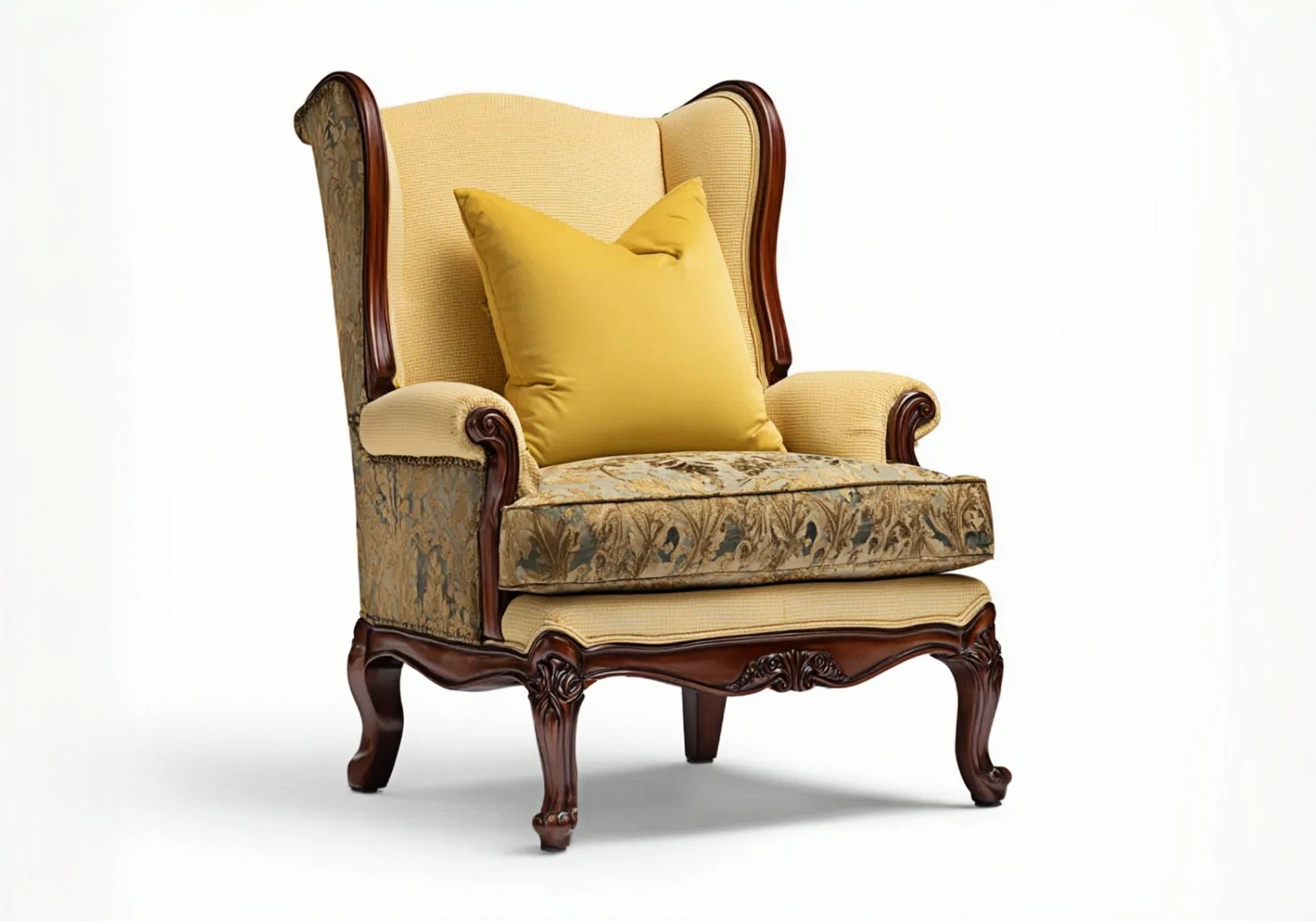 La estructura está fabricada en madera resistente que proporciona estabilidad y durabilidad. El asiento y el respaldo están tapizados en tejido de terciopelo suave en color beige que aporta una sensación agradable al tacto. Los detalles decorativos tallados en la estructura realzan el aspecto clásico del sillón y aportan un acabado refinado.