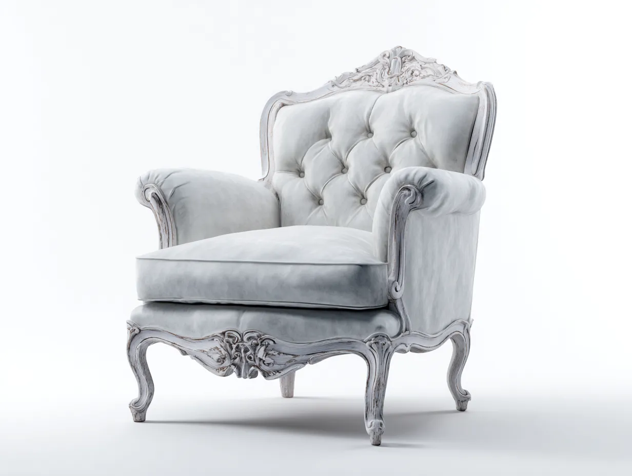 El sillón cuenta con una estructura de madera que proporciona estabilidad y durabilidad. El asiento y el respaldo están tapizados en tela de color gris claro con acolchado suave para mejorar la comodidad. Los detalles decorativos tallados en la estructura de madera aportan un aspecto refinado que resalta el carácter clásico del mueble.