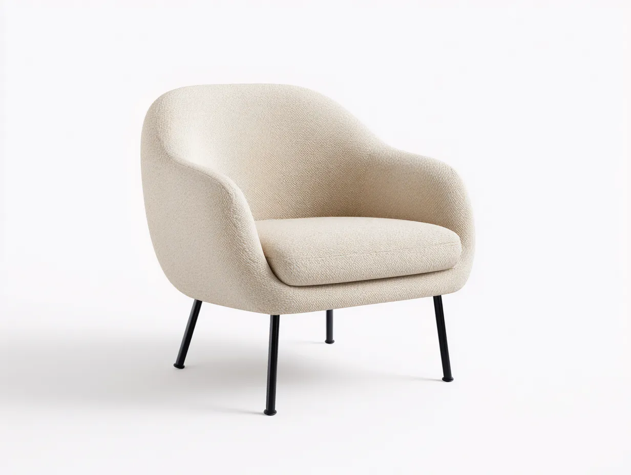 El asiento y el respaldo están tapizados en tela bouclé de color beige que ofrece una textura suave y agradable al tacto. La estructura interior proporciona estabilidad para el uso cotidiano. Las patas metálicas en color negro aportan soporte firme y un contraste visual moderno con el tejido claro.