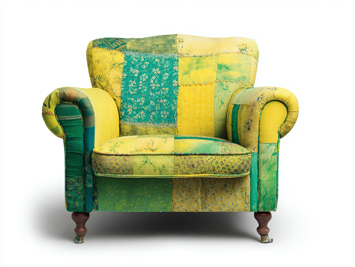 El sillón está tapizado en tela con una combinación de colores verde y amarillo que crea un efecto visual distintivo. La estructura interior proporciona estabilidad durante el uso cotidiano. El asiento acolchado y el respaldo suave ofrecen una superficie cómoda para descansar.