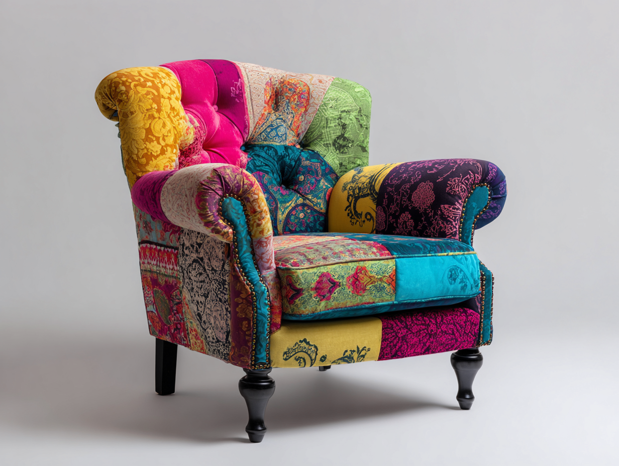Este sillón destaca por su diseño decorativo y su asiento cómodo pensado para espacios interiores como salas de estar dormitorios o zonas de lectura. El estilo patchwork multicolor aporta un carácter distintivo que permite utilizarlo como pieza decorativa dentro del ambiente. Su respaldo acolchado y asiento amplio ofrecen una experiencia de descanso confortable.