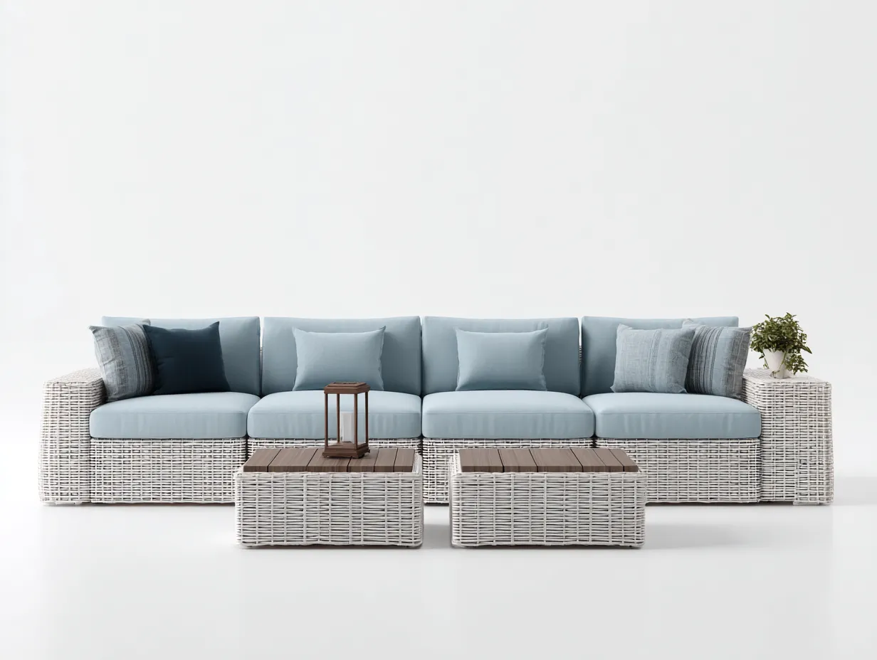 El conjunto incluye módulos de asiento amplios que permiten organizar un área de descanso espaciosa. Los cojines acolchados ofrecen comodidad durante largos periodos de uso. Las mesas bajas con superficie plana proporcionan un espacio práctico para colocar bebidas, libros u objetos decorativos, complementando el conjunto para un uso cotidiano en exteriores.