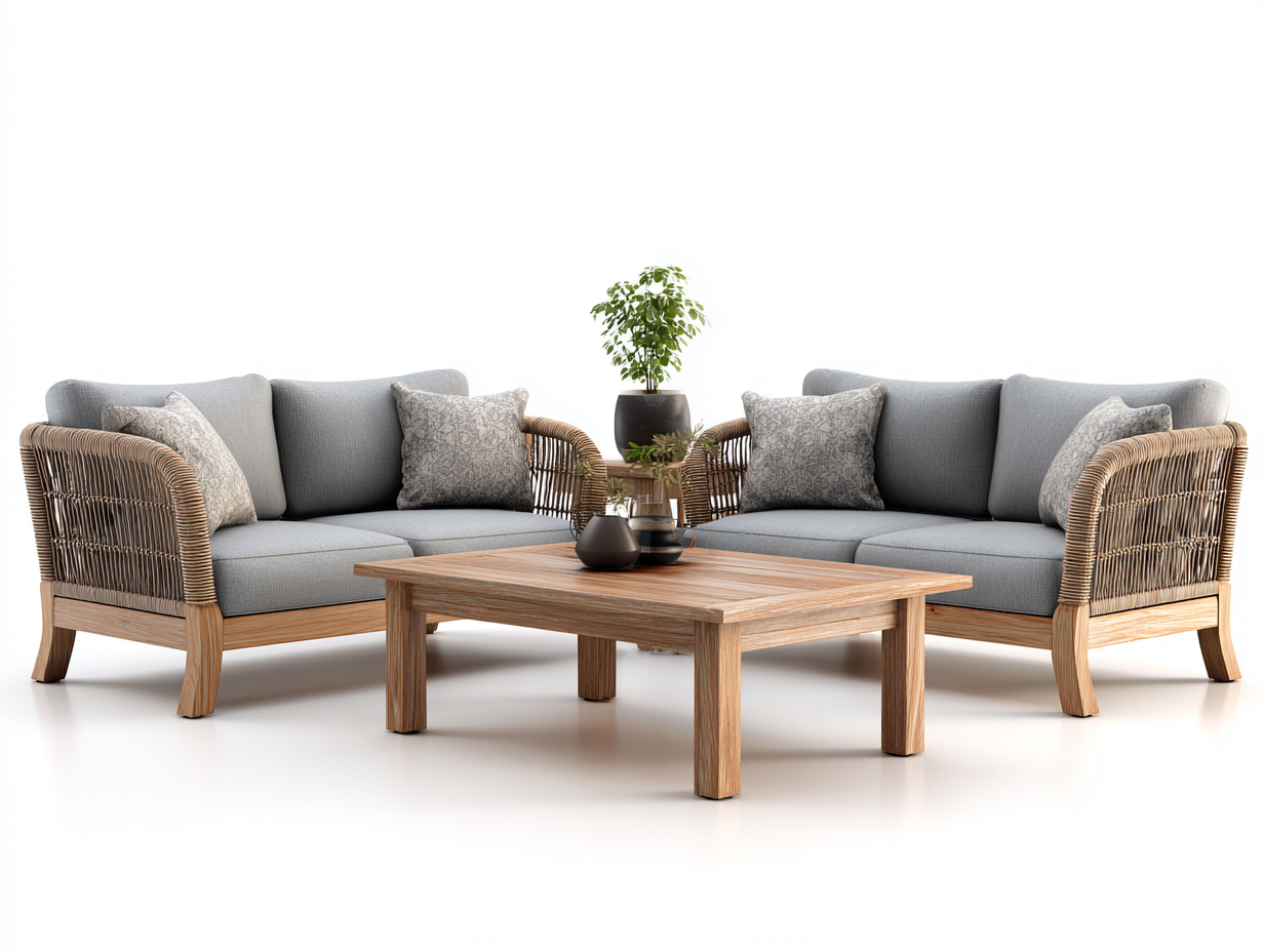 Los sofás cuentan con una estructura de madera con laterales de ratán trenzado en color marrón que aporta un aspecto natural al conjunto. Los cojines acolchados en color gris proporcionan comodidad durante el uso. La mesa central está fabricada en madera con superficie amplia que facilita el apoyo de bebidas u objetos decorativos.