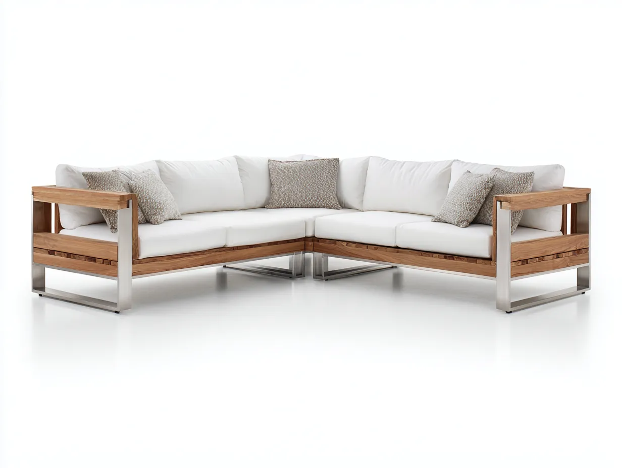 El formato en esquina ofrece un área amplia de asiento adecuada para compartir momentos de descanso en exteriores. Los reposabrazos laterales brindan apoyo adicional y la base sólida garantiza estabilidad durante el uso. Su diseño moderno facilita su integración en diferentes estilos de decoración exterior.